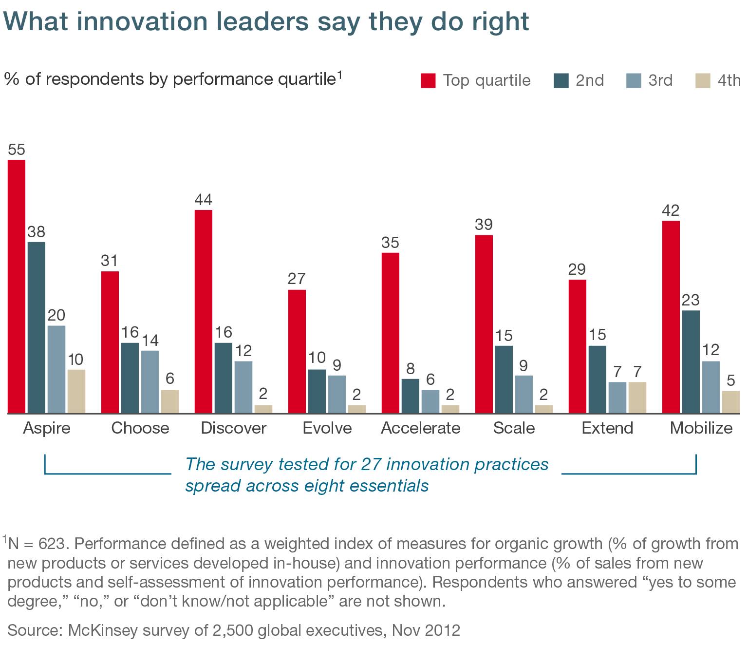 乔布斯曾说:“领袖和跟风者的区别就在于创新。” 创新,一个经常被提及的话题,却因为它不断变化的本质让人们始终琢磨不透。上一秒新奇独特的视角下一秒就人手一份,前一天无人问津的想法转眼间炙手可热,这就是创新化腐朽为神奇的奇妙能力。 想让公司保持持续的活力,除去新鲜血液的注入和新兴领域的探索,还有不断坚持创新。对于创始人而言,如何以不变的内核应万变的市场?今天我们就跟大家分享一篇麦肯锡的创新要领,它为我们提供了八大法则——追求、选择、发现、变革、加速、规模、延伸、动员,希望对你有所帮助。 众所周知,对一个制度完善的公司来说,创新难上加难。一般来说,这些公司更善于执行而非创新。其中大多数公司都是通过优化现有业务,而非颠覆性的创意来取得成功。 尽管对大型公司来说,创新十分困难;但像美铝公司(Alcoa)、发现集团(the Discovery Group)和美国航天局阿姆斯研究中心(Ames Research Center)等大型机构,依旧不断坚持打破传统。那么创业公司能从这些经验中学到什么呢?我们进行了一项研究,与全球众多行业的 300 多家公司及 2500 多名高管开展深入访谈、研讨会及问卷调查。通过这一研究,我们找到了这个问题的核心。我们发现,如果一家大型公司在产品、流程或商业模式的创新方面表现优异,那么这家公司或多或少具备以下八个基本属性: